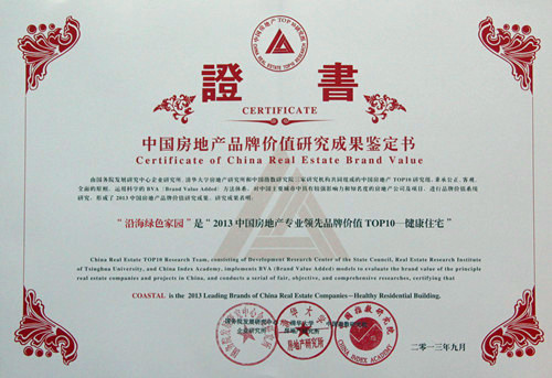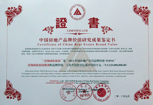 2013年9月12日,“2013中國房地產(chǎn)品牌價(jià)值研究成果發(fā)布會(huì)暨第十屆中國房地產(chǎn)品牌發(fā)展高峰論壇”在國家會(huì)議中心召開,沿海綠色家園集團(tuán)(以下簡(jiǎn)稱“沿海集團(tuán)”)憑借持之以恒的品牌建設(shè),以及對(duì)“健康住宅”的堅(jiān)持和戰(zhàn)略推動(dòng),以51.25億元的品牌價(jià)值榮獲“2013年度中國房地產(chǎn)品牌價(jià)值TOP10”和“2013年中國房地產(chǎn)專業(yè)領(lǐng)先品牌TOP10-健康住宅”。這是沿海集團(tuán)連續(xù)十年蟬聯(lián)“中國房地產(chǎn)品牌價(jià)值TOP10”,連續(xù)九年蟬聯(lián)“健康住宅專業(yè)領(lǐng)先品牌”。