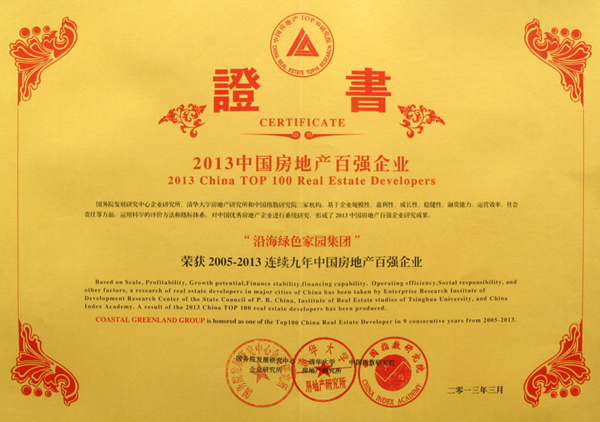 2013年3月29日,由國務(wù)院發(fā)展研究中心企業(yè)研究所、清華大學(xué)房地產(chǎn)研究所和中國指數(shù)研究院三家單位共同主辦的"2013年中國房地產(chǎn)百強(qiáng)企業(yè)研究成果發(fā)布會(huì)"在北京釣魚臺(tái)國賓館隆重舉行,沿海綠色家園集團(tuán)連續(xù)九年榮膺“中國房地產(chǎn)百強(qiáng)企業(yè)稱號(hào)”,且連續(xù)九年排名百強(qiáng)50名內(nèi)。