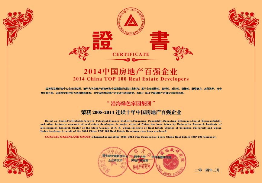 2014年3月27日上午,北京釣魚臺國賓館嘉朋滿座,由國務(wù)院發(fā)展研究中心企業(yè)研究所、清華大學(xué)房地產(chǎn)研究所和中國指數(shù)研究院三家單位共同主辦的房地產(chǎn)盛會——“2014年中國房地產(chǎn)百強企業(yè)研究成果發(fā)布會”在此隆重舉行,沿海綠色家園集團不負(fù)眾望,連續(xù)十年獲頒“中國房地產(chǎn)百強企業(yè)稱號”殊榮。