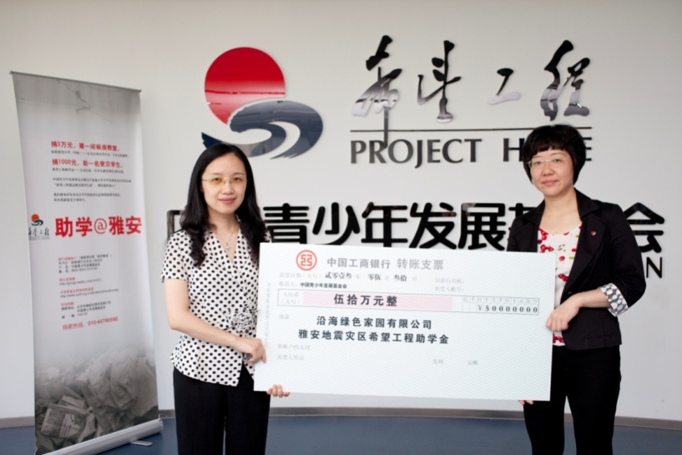 災(zāi)難無情人有情。5月30日上午,沿海綠色家園有限公司(以下簡稱沿海集團(tuán))品牌總監(jiān)童新華女士在北京中國青少年發(fā)展基金會總部將沿海集團(tuán)以及全體沿海人共同捐贈的50萬元善款親手交到姚文副秘書長的手中。據(jù)悉,此次捐款將通過“希望工程緊急救災(zāi)助學(xué)行動”用于資助雅安災(zāi)區(qū)家庭困難的500名學(xué)生,幫助他們順利完成學(xué)業(yè)。