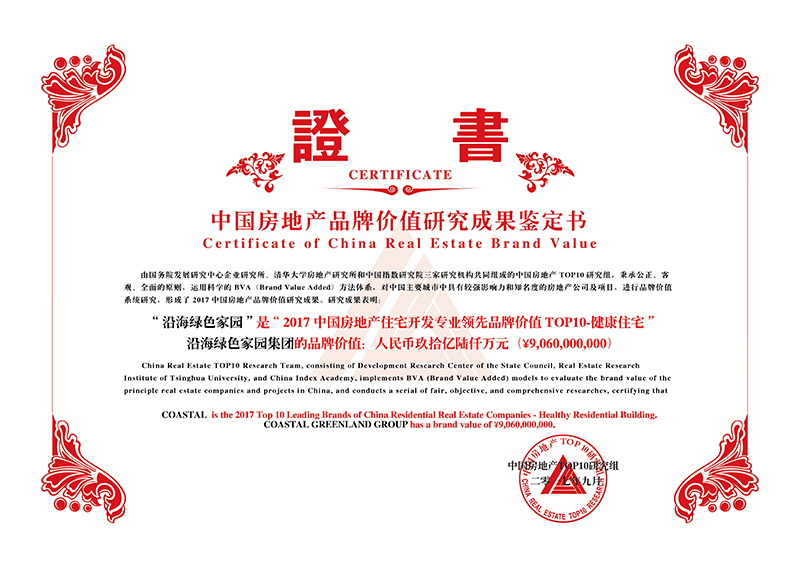 2017年9月14日,由國(guó)務(wù)院發(fā)展研究中心企業(yè)研究所、清華大學(xué)房地產(chǎn)研究所和中國(guó)指數(shù)研究院三家研究機(jī)構(gòu) “2017中國(guó)房地產(chǎn)品牌價(jià)值研究成果發(fā)布會(huì)”在北京雁棲湖國(guó)際會(huì)議中心召開,沿海綠色家園集團(tuán)(以下簡(jiǎn)稱“沿海集團(tuán)”)憑借其清晰的品牌定位、企業(yè)經(jīng)營(yíng)的穩(wěn)健性、在健康住宅細(xì)分市場(chǎng)的領(lǐng)先優(yōu)勢(shì),以及對(duì)行業(yè)和社會(huì)的貢獻(xiàn)獲得了社會(huì)各界的肯定,連續(xù)13年榮獲中國(guó)房地產(chǎn)TOP10研究組頒發(fā)的“中國(guó)房地產(chǎn)專業(yè)領(lǐng)先品牌價(jià)值TOP10—健康住宅”榮譽(yù),并憑借其在房產(chǎn)開發(fā)、城市發(fā)展運(yùn)營(yíng)、健康生活服務(wù)等多個(gè)領(lǐng)域的突出表現(xiàn),連續(xù)14年位居“中國(guó)房地產(chǎn)公司品牌價(jià)值TOP10”的行列,品牌價(jià)值躍升至90.6億,創(chuàng)歷史新高。同時(shí),沿海集團(tuán)行政總裁夏向龍先生入選“2017年中國(guó)房地產(chǎn)品牌貢獻(xiàn)人物”