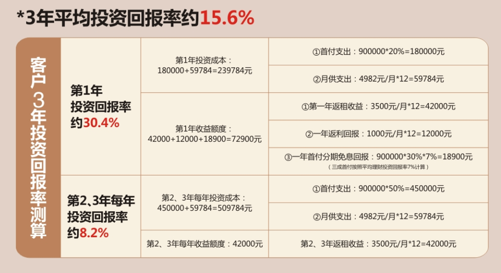 ?不同于商鋪與住宅屬性, J·LOFT產品,極大滿足了投資者進駐漢口核心商圈的愿望。J·LOFT產品層高5米,單層計價復式空間,買一層得兩層,可租可住可辦公,LOFT產品成為投資首選,除了低總價、買一得二的高性價比屬性,在投入產出比上也遙勝其他物業(yè)。下面我們針對一套總房款約90萬的房源為例測算三年的收益率:購買J?loft可享受的收益優(yōu)惠:1、首付分期優(yōu)惠:客戶只需首付2成,享首付免息墊付3成,1年內付清首付即可2、返利優(yōu)惠:客戶可享一年每月1000元返利3、平均返租收益:客戶可享一年每月3500元租金收益。